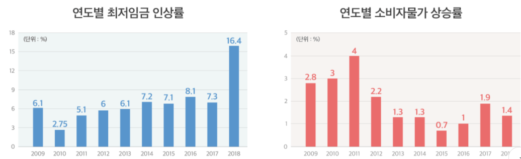 아래 그래프에서 살펴보면 최저임금이 대폭 인상된 2018년 물가상승률은 오히려 2017년 보다 폭이 줄어 줄었음을 보이고 있습니다.