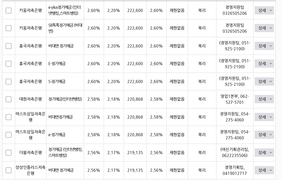 "상세정보" 를 누르면 저축 상품의 자세한 정보와 홈페이지, 전화번호등이 표시가 되니 맘에 드는 상품을 선택하셨으면 상세한 정보를 확인한 후에 가입을 하시는 것을 추천 드립니다.