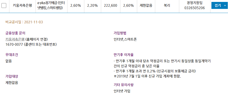 현재 21년 11월 5일 기준으로 "키움저축은행" 회사의 "e-plus정기예금"이 세후 이자 2.20%로 제일 높은 금리를 제공을 하고 있습니다. 앞서 예금액을 입력을 했으면 만기 후에 이자로 확인해 보실 수 있습니다.