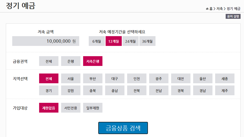 아래 그림에서와 같이 저축하고자 하는 금액과 기간을 선택을 하고 금융권역을 저축은행으로 선택을 하면 높은 금리 순으로 상품이 정렬되어서 표시가 됩니다.